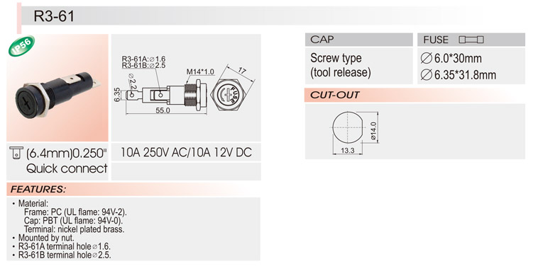 6*30 面板安裝保險(xiǎn)絲座 R3-61 UL CSA ROHS