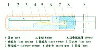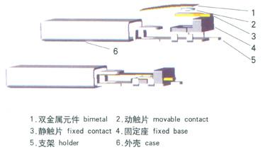 BR/TH-A1D series thermal protector is composed by heat conductive metal shell, bimetal component welded silver alloy contact, current conductive frame, insulated fixing seat, static contact pad and heat resistant wires etc. When the current goes through the bimetal component with impedance, if the current increases or the environment temperature rises and the temperature reaches the preset value, the bimetal component will work and release the contact to shut off the circuit; and by contrast, if the device cools down to the safe temperature, the contact point will reset automatically.